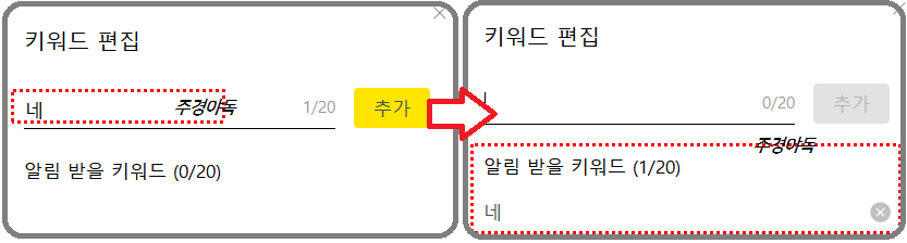 키워드 편집에 예시로 '네'를 입력했습니다.