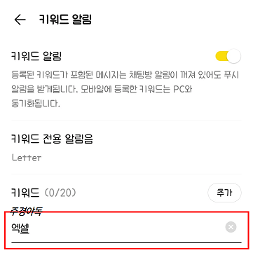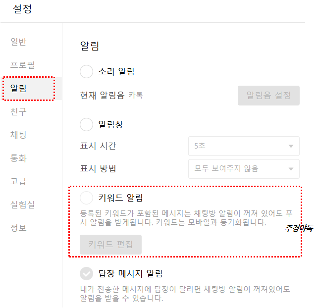 저는 알림창을 활성화 한 후 [키워드 알림]을 선택했습니다.