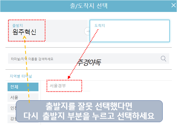 만약 출발지를 잘못 선택했다면 다시 출발지 부분을 누르시면 재선택 하실 수 있습니다.