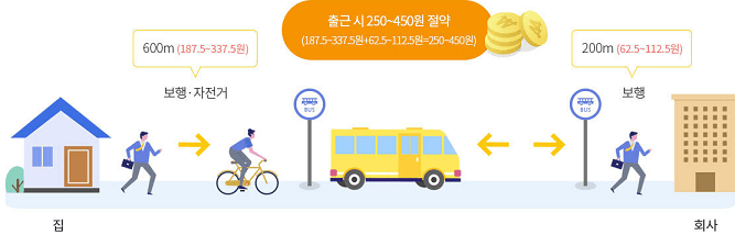 ② (마지막정류장(하차카드태그)~회사(도착버튼)의 도보거리 합으로 해당거리에 비례하여 마일리지 금액이 적립됩니다.