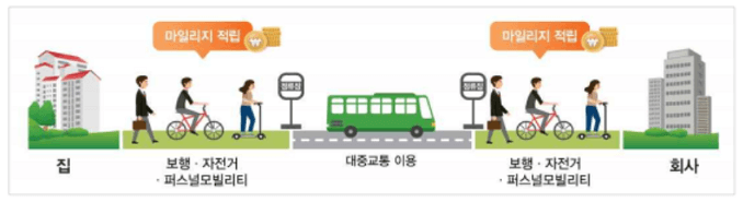 - 마일리지 환산거리는 ① 자택(출발버튼)~첫정류장(승차카드태그) 도보거리와
