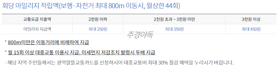 - 오전 6시 30분 이전 대중교통을 이용하면 얼리버드 추가 마일리지(기본 마일리지의 50%)가 지급된다고 합니다~~!!