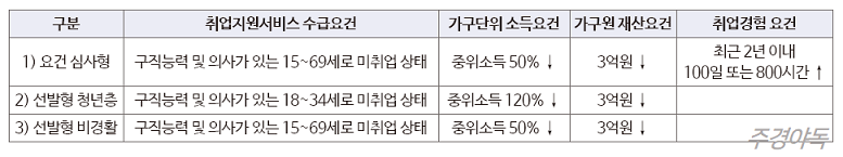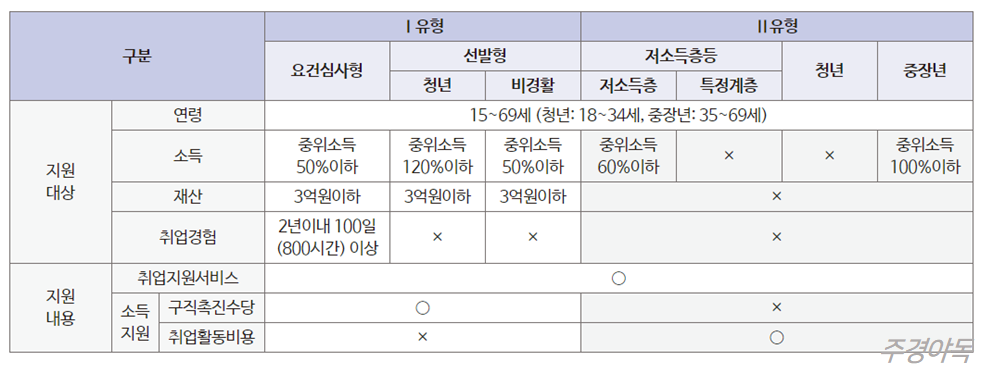 - 중장년층: 35~69세, 기준 중위소득 100% 이하인 구직자