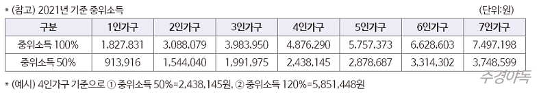 - 기준 중위소득 50% 이하, 가구 단위 재산 3억원 이하