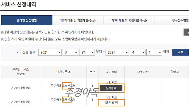 [민원신청하기]를 누르면, 서비스 신청내역이 나옵니다.