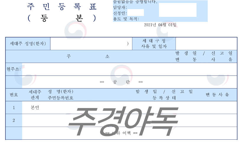 🔷주민등록등본은 본인이 지금 현재 살고 있는 주소지의 세대주와 구성원에 대한 정보가 나와있는 것입니다.