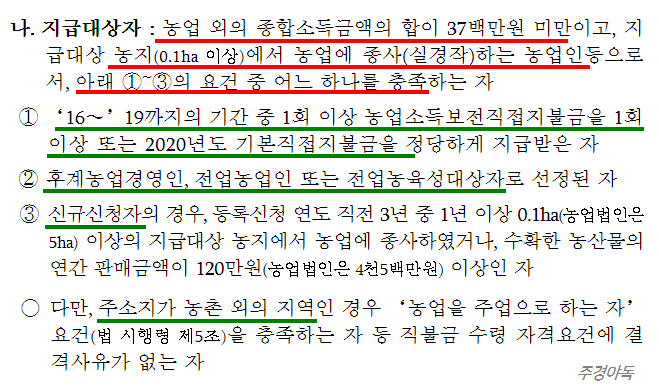 - 농가 내 지급대상자 각 농업외 종합소득금액: 2천만원 미만
