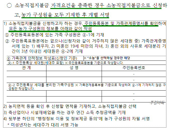 - 농가 내 지급대상자 각 농촌 거주기간: 3년 이상