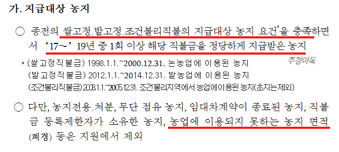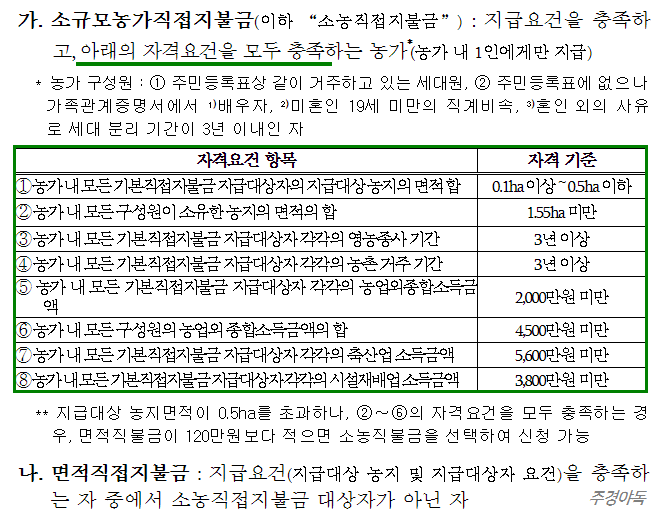 - 농가 내 지급대상자의 지급대상 농지의 면적합: 0.1ha~0.5ha이하
