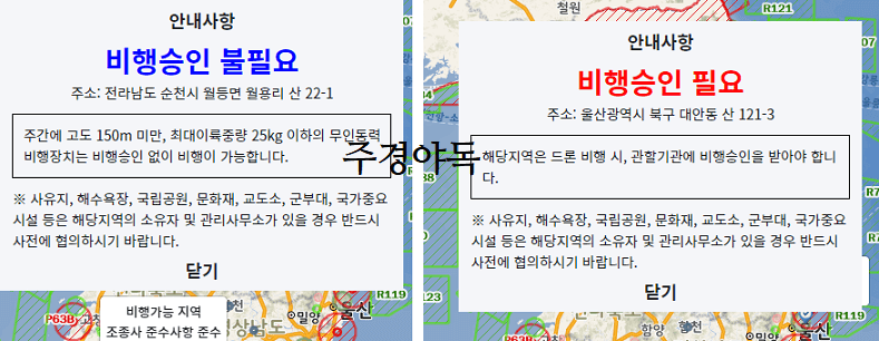 또한 오른쪽 그림에는 비행승인이 필요하다고 나왔는데요. 울산광역시 북구 대안동 산 121-3 지역입니다.
