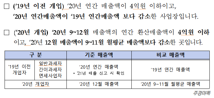 - 2020년에 개업하였다면 2020년 9월~12월의 기간동안 연간 환산 매출액을 기준으로 합니다.