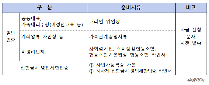 - 사행성업종, 약국/병원/회계사/변호사 등 전문직종과 금융/보험 관련 업종 등 소상공인 정책자금 융자제외 업종은 지원에서 제외됩니다.