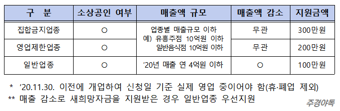- 지원 대상은 집합금지 업종, 영업제한 업종, 일반 업종에 해당하는 소상공인*이며, 매출액 규모 및 매출액 감소 관련 요건을 만족할 경우 지원이 가능합니다.