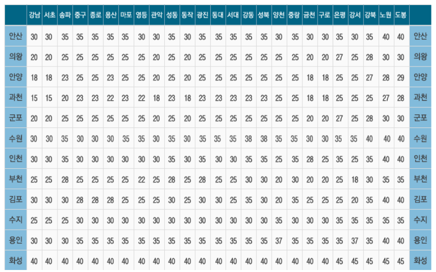 경기도~수도권 요금표