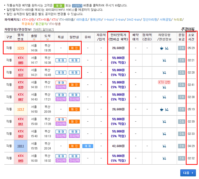 오른쪽에 기차 전체로 검색할 건지 선택해주고, 나는 KTX만 조회하겠다 하시면 KTX만 선택하셔도 되요.