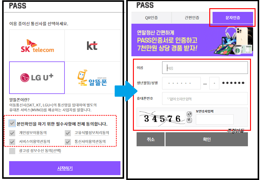 PASS 인증화면이나오는데요. 여기서 저는 휴대폰 통신사를 LGU라고 가정해보겠습니다.