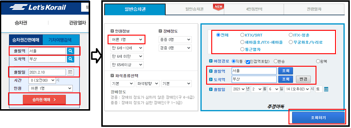 대부분 전체로 선택 그대로 놔두시고 출발역~도착역만 조회해서 선택해주세요.