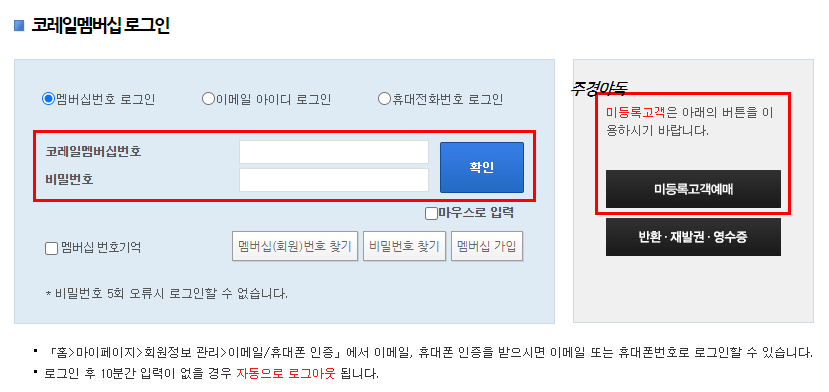 회원가입을 안하신 분은 여기서 미등록 고객예매를 선택하면 됩니다.