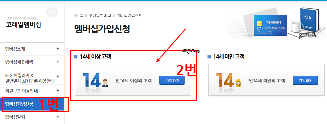 왼쪽메뉴에서 코레일 멤버십 가입신청을 선택 후, 14세 이상 고객을 눌러주세요.