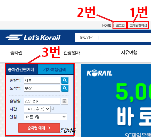 만약에 코레일 아이디가 있으시다면 그림의 2번을 눌러서 로그인을 먼저 해주세요.