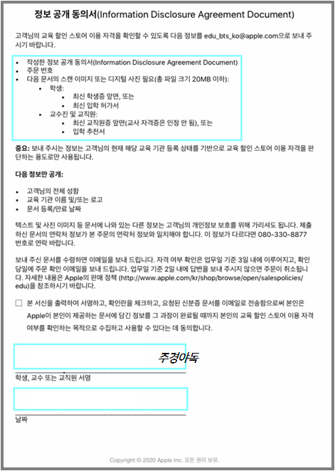 내용에는 작성한 정보 공개 동의서와 주문번호, 학생/교직원 서류를 스캔한 이미지를 첨부하여 답변메일을 보내라고 한답니다. 🙂