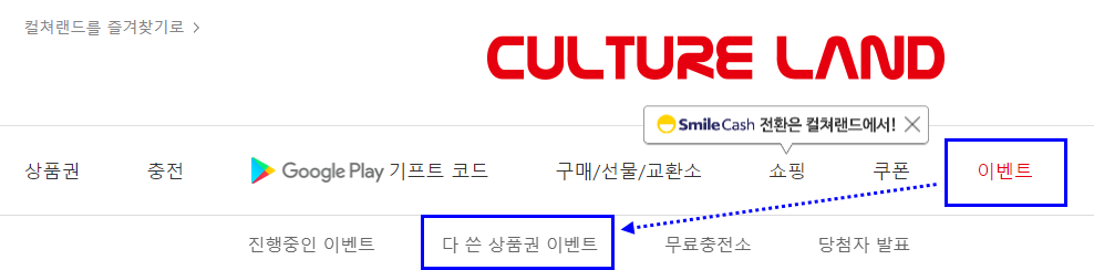 - 주요 메뉴 중에 이벤트에 보시면, [다 쓴 상품권 이벤트]가 보이실 겁니다.