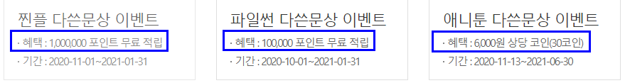 제공하는 곳에 따라 무려 백만포인트, 십만포인트, 6천원 상당의 코인을 무료로 받을 수 있습니다.