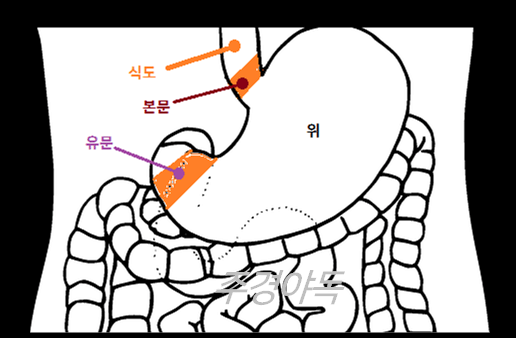 위에 음식이 들어가면 1~4시간 정도 머뭅니다. 이후, 유문(날문)이 열리면서 십이지장으로 내려갑니다. 이때, 강한 위산과 혼합된 음식이 장으로 이동하려면, 장에서 알칼리성인 담즙, 취장액, 장액이 충분하게 분비가 된 후에 유문이 열립니다.