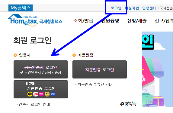 바로 상단에 로그인을 클릭하셔서 공동인증서(구 공인인증서)나 간편인증을 이용하여 로그인을 해주시기 바랍니다.