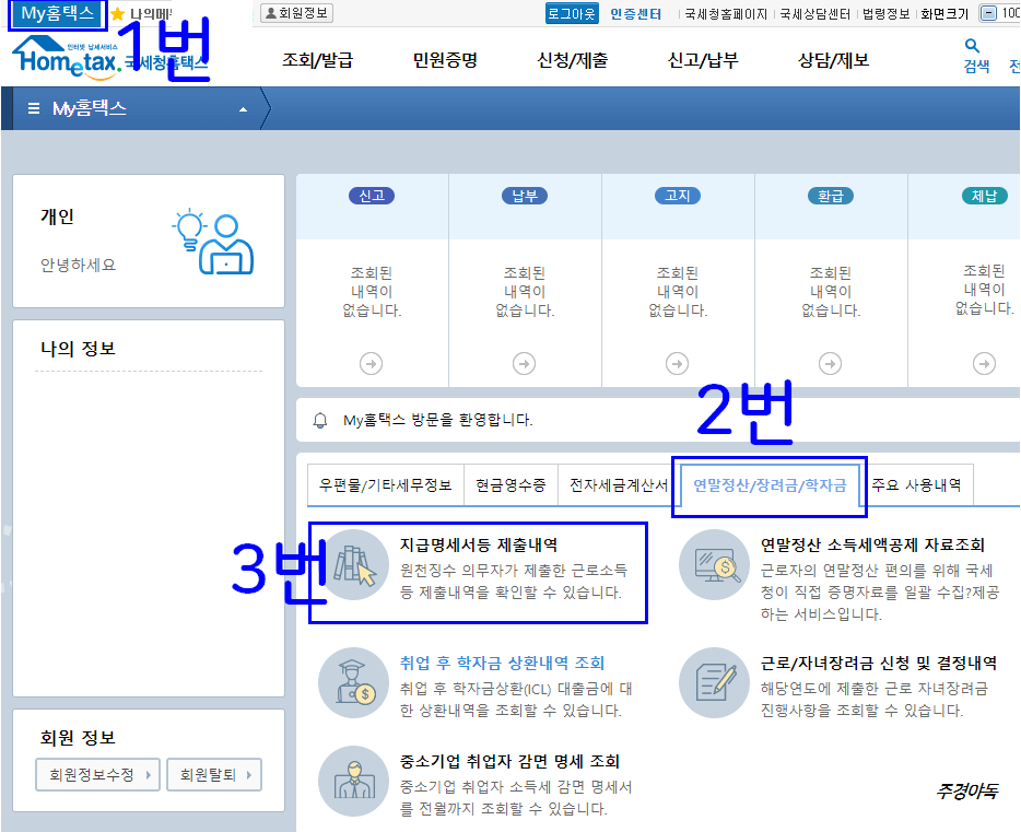 OOO님 왼쪽에 보면, My홈택스가 있습니다. 제가 1번이라고 기재해 놓았습니다.