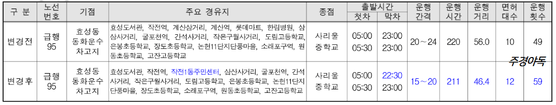 급행95번 차량 재배치로 운행횟수 및 배차간격 조정