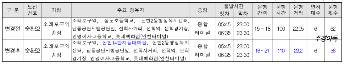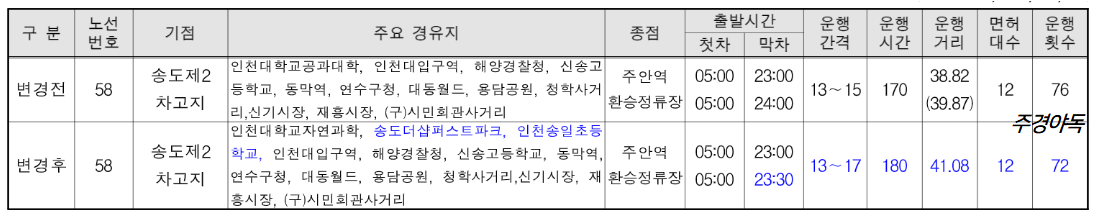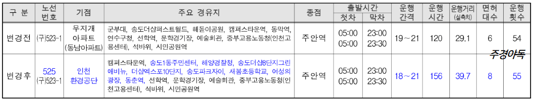 - 트리플스트리스 미경유로 변경하고 송도스포츠 ~ 센터 방향으로 수요 맞춤형으로 노선 효율성을 개선함