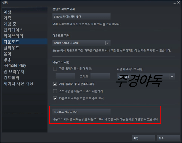 ○스팀 –> 설정 –> 다운로드 –> 다운로드 캐시 지우기로 갑니다.