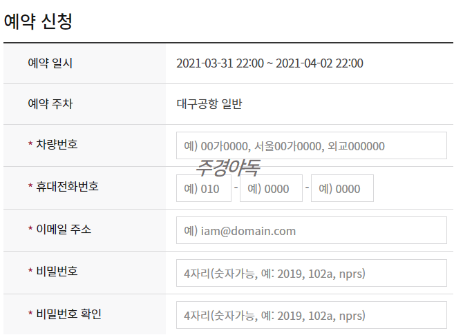 ✔예약신청을 위해 차량번호 등 정보를 기재 한 후 예약하기를 완료하시면 됩니다.
